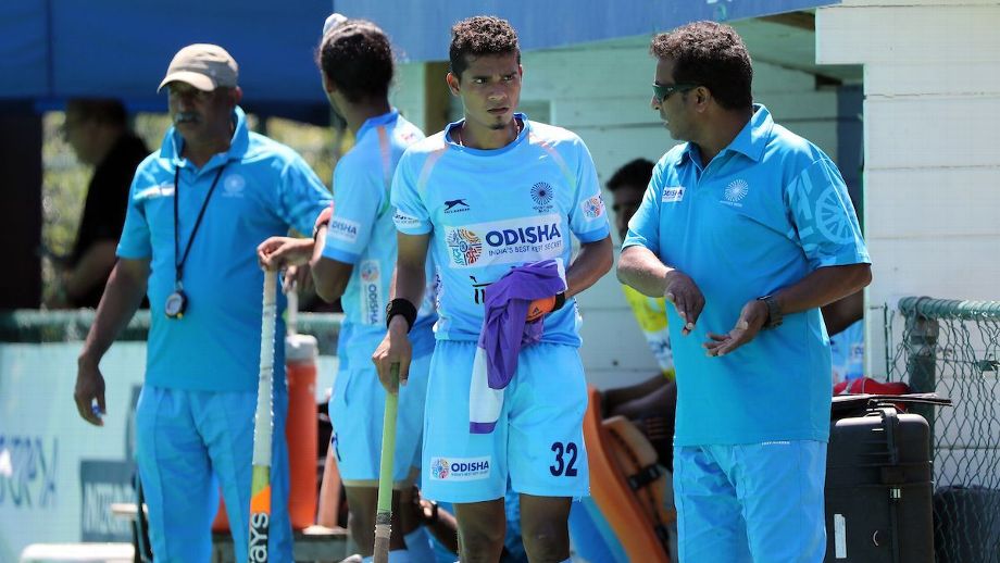 Former India junior coach Jude Felix (right) in a file picture, seen passing on instructions to Shilanand Lakra during an India-Ireland match in Antwerp, Belgium in 2018. Hockey India