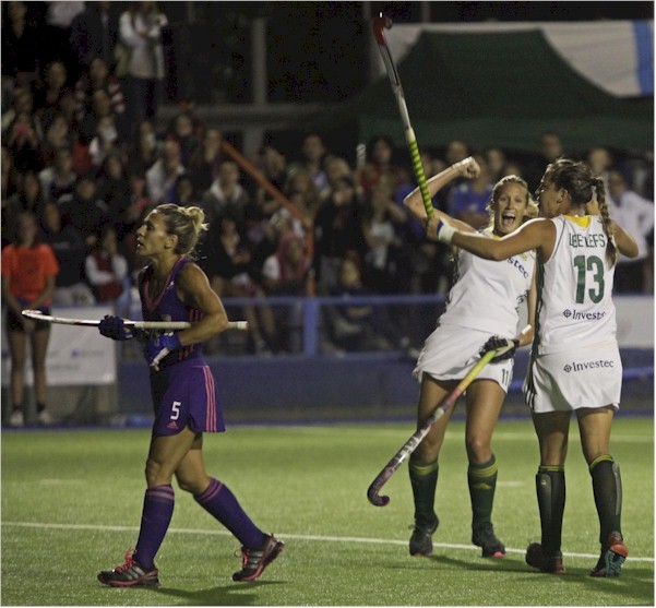 Marcelle Manson (second from right) celebrates fellow SA defender Lisa Deetlefs' goal) while Perez Rodriguez of Argentina reflects during the first Test at Mar del Plata last Saturday. Photo: DIEGO IZQUIERDO