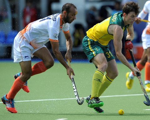 Australia's Kieran Govers, left, and India's Manpreet Singh challenge for the ball.