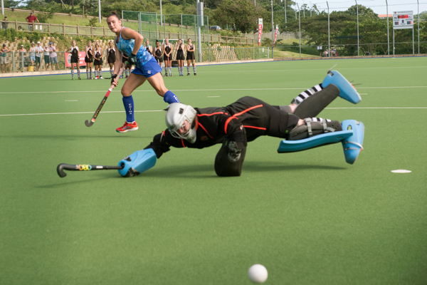 Crawford La Lucia’s goalkeeper Georgia Saunders dives for the solid shot delivered by Our Lady of Fatima’s Paige Horn’s in the penalty shoot out of the finals of the Durban North Regionals of the SPAR KZN Schoolgirls’ Hockey Challenge that took place at Ashton International College in Ballito on Sunday 8 March. Pic by Val Adamson