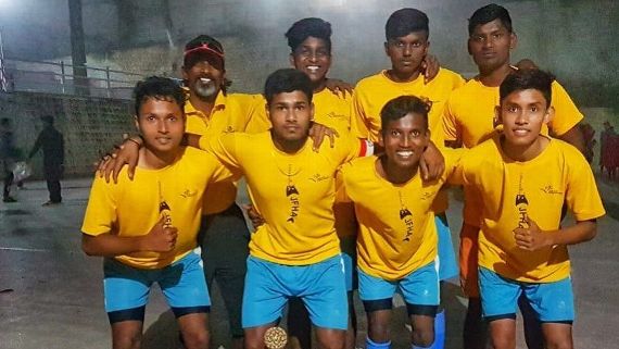 JFHA's Deepandhar (front row, right) poses with his teammates after their title win at the Dhyan Chand six-a-side invitational tournament in Mussoorie in August 2019. Facebook/Jude Felix Hockey Academy Charitable Trust