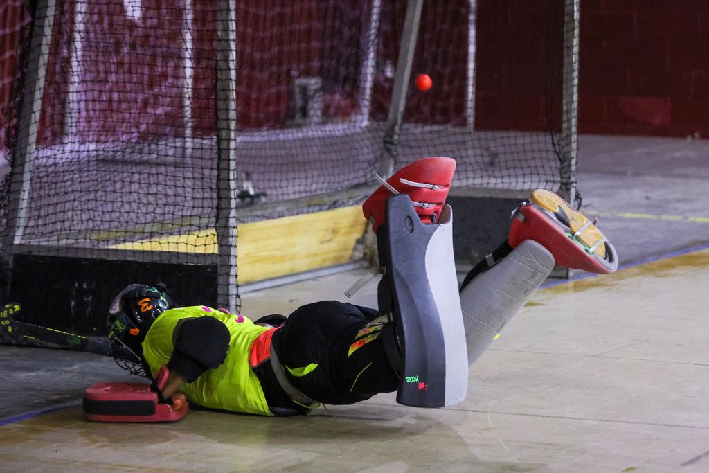 Old Fort’s goalkeeper Tony Cole dives in vain to stop a QPCC goal during the Ventures Indoor Hockey International Invitational Tournament men’s division Pool A match at the Woodbrook Youth Facility in Port-of-Spain on Thursday. QPCC won 3-0. DANIEL PRENTICE