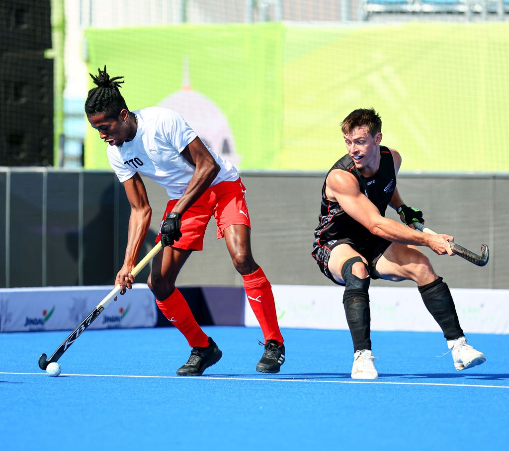 England-based Teague Marcano continued his stellar display at the inaugural 16-nation FIH Hockey 5s World Cup with a five-goal outing to lead the Calypso Stickmen to an emphatic 11-4 mauling of New Zealand to top Pool C in Muscat, Oman, on Monday.