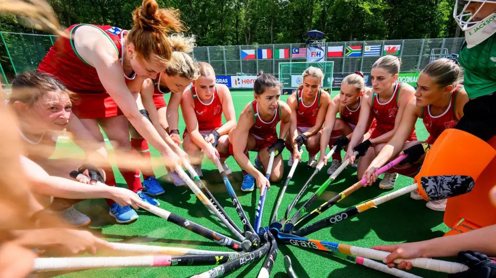 Beth Bingham (centre) addresses the Wales players. Image source, FIH_WorldSportPics
