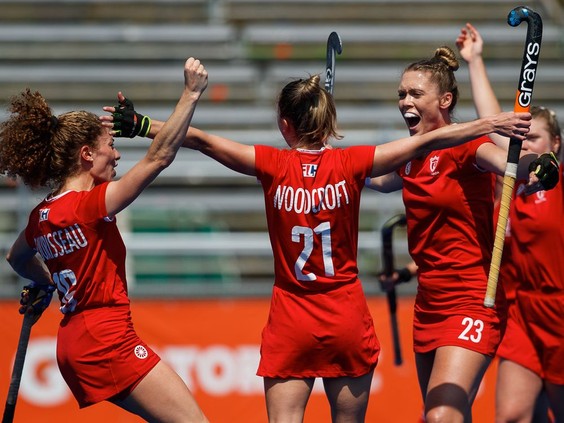 Canada's women’s field hockey team celebrates its 1-0 victory over the United States in the bronze medal match of the Pan Am Cup in Santiago, Chile, on Jan. 29 to clinch a berth in the 2022 World Cup. Photo by Oscar Muñoz Badilla