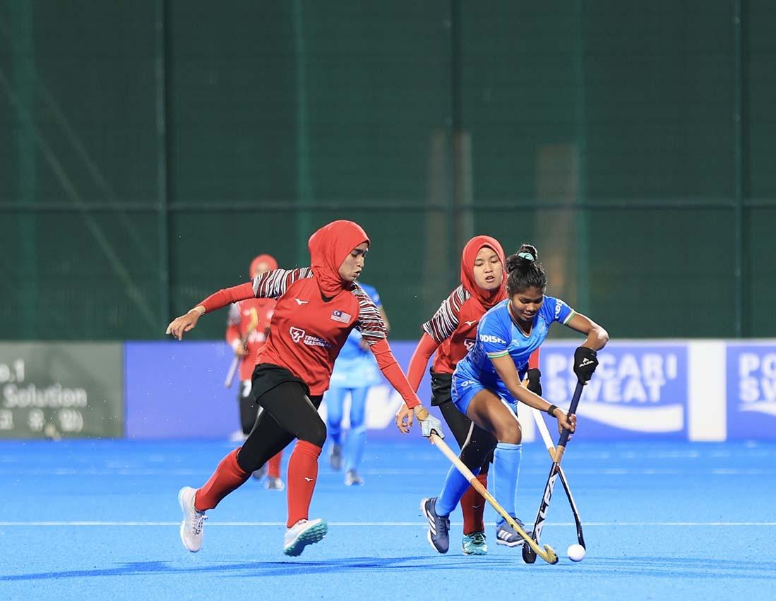 Defending champion India overcame a slow start to secure a dominant 5-0 victory over Malaysia in their Women’s Junior Asia Cup match on Monday.